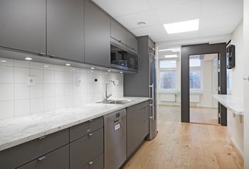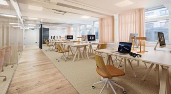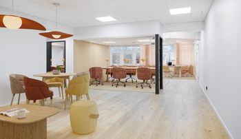 Effektiv planlösning med ett öppet landskap, flertalet glasade mötesrum, dubbla WC samt ett pentry. Möjlighet finns att ta ned mötesrummen om en större öppen planlösning önskas.