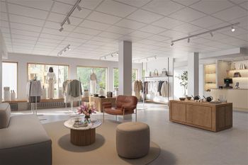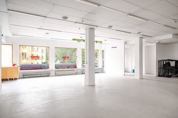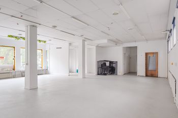 Lokal i två våningar. Öppen planlösning med några mindre rum, WC och pentry. Nedre våningen med personalrum och lager.