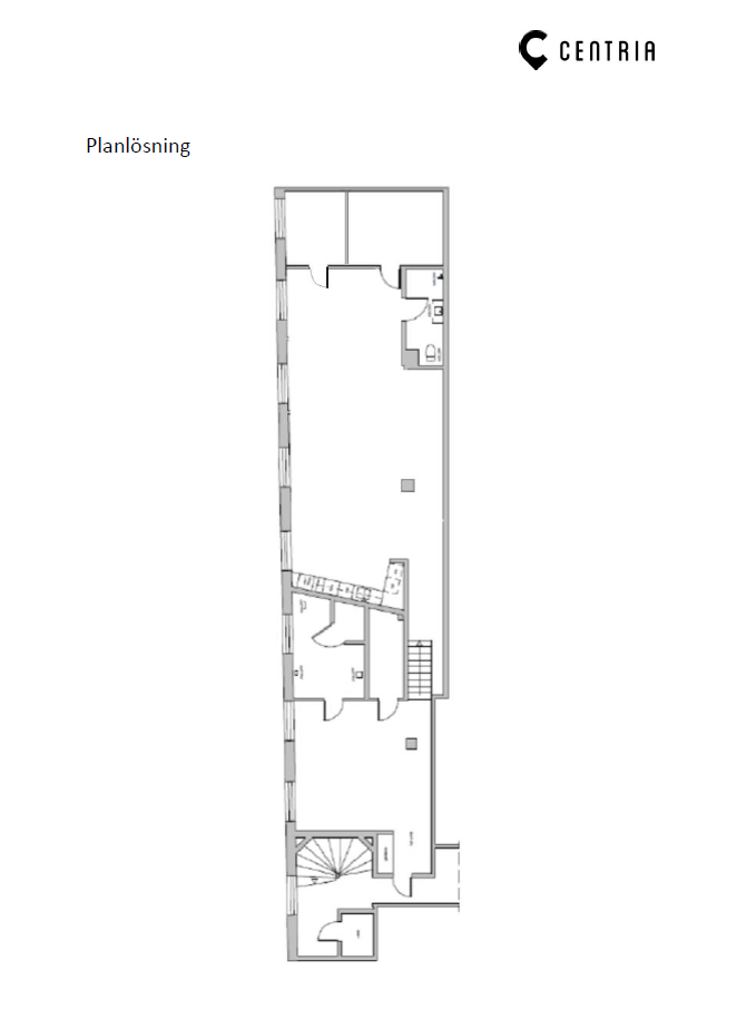 Lokalen är utformad med tre kontorsrum i olika storlekar, en öppen kontorsyta, pentry, ett förråd samt två WC varav den ena med dusch och bastu.